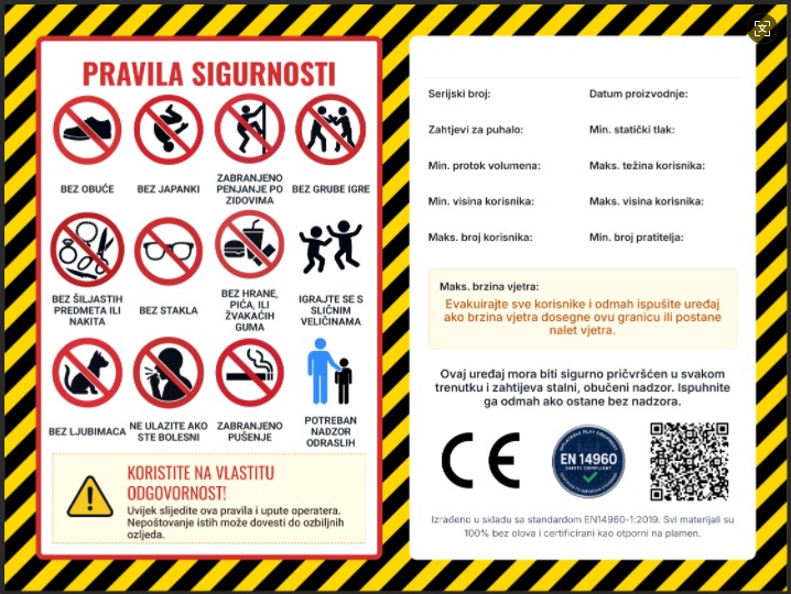 - Osigurajte da jedinica za napuhavanje nije pretrpana. Ograničite broj korisnika kako bi se svakom djetetu omogućilo dovoljno prostora za sigurnu igru.
