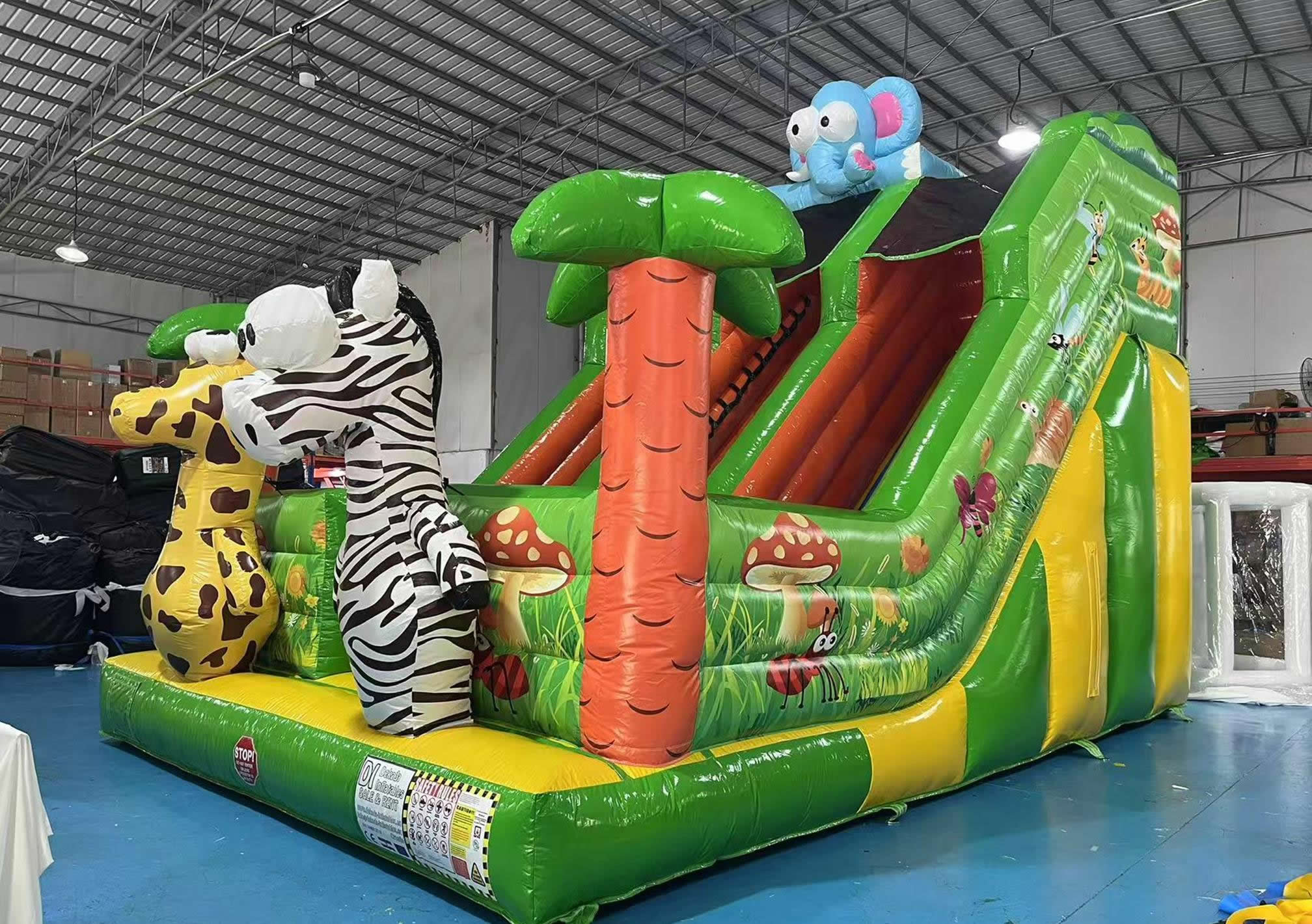 Ovaj impresivni napuhanac krase vesele 3D figure žirafe, zebre i simpatičnog plavog slona na vrhu.